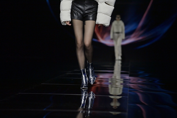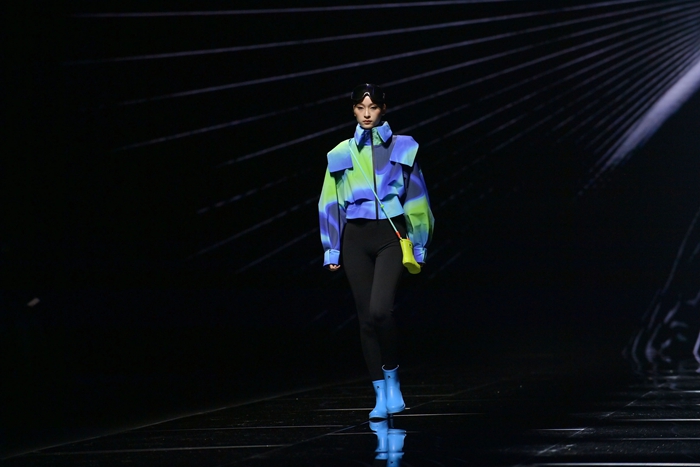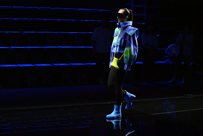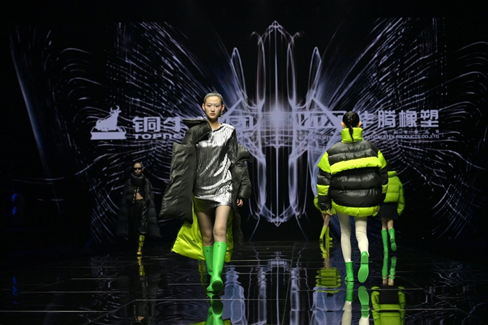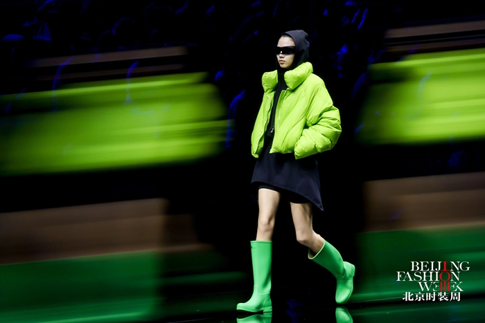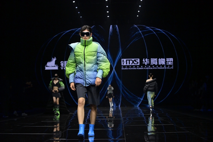 整個(gè)秀場(chǎng),靚麗前衛(wèi)的膠靴或踏于足下,或成為時(shí)尚新品挎于體側(cè),伴著強(qiáng)勁的樂(lè)曲,綻放出化工科技在時(shí)尚前沿的另類(lèi)美學(xué)。